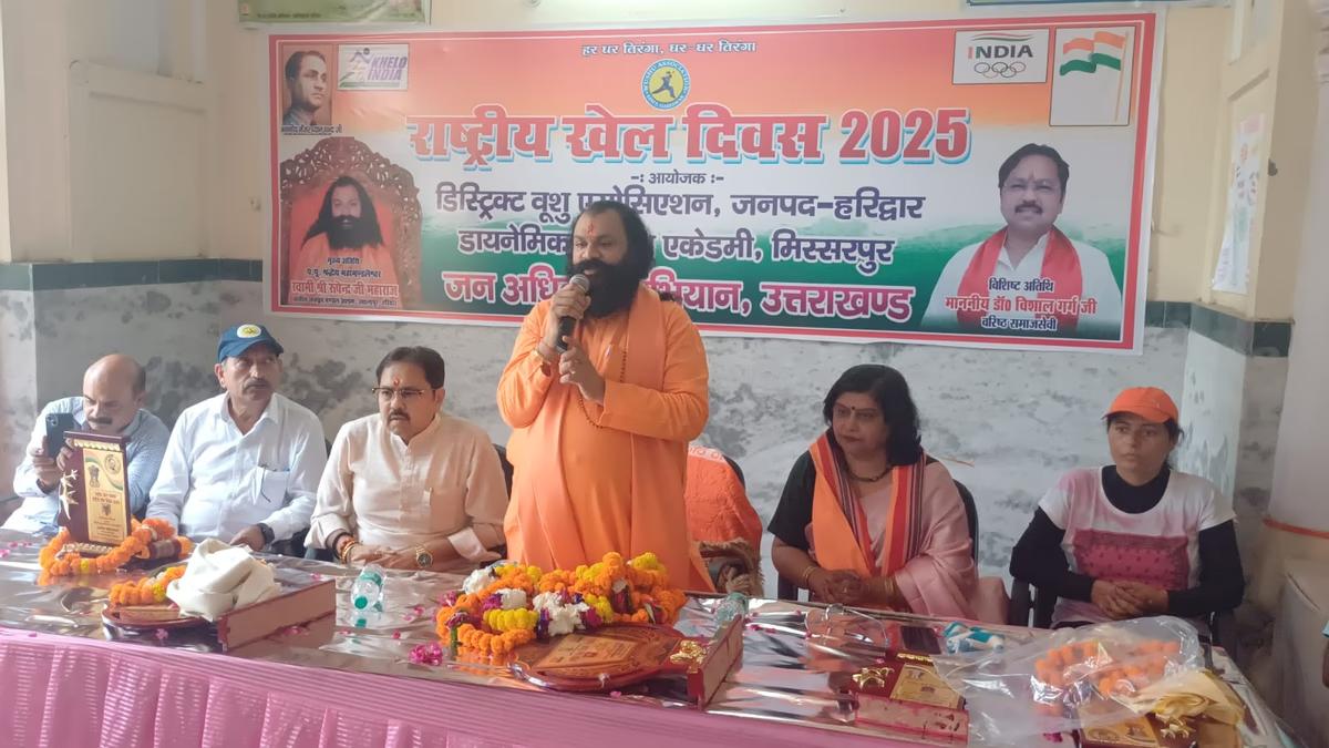 हरिद्वार : राष्ट्रीय खेल दिवस की पूर्व संध्या पर श्री मिथिलेश सनातन धर्म इंटर कालेज, सतीघाट कनखल में एक भव्य और दिव्य समारोह का आयोजन किया गया। डिस्ट्रिक्ट वूशु एसोसिएशन जनपद हरिद्वार और डायनेमिक स्पोर्ट्स क्लब मिस्सरपुर एवं जन अधिकार अभियान संस्था द्वारा संयुक्त रूप से यह आयोजन किया गया। कार्यक्रम का शुभारंभ मुख्य अतिथियों द्वारा दीप प्रज्वलित कर और मां सरस्वती के चित्र एवं श्री सनातन धर्म प्रतिनिधि सभा (पंजाब) नई दिल्ली के संस्थापक त्याग मूर्ति गोस्वामी गणेश जी की प्रतिमा पर माल्यार्पण कर किया गया।
